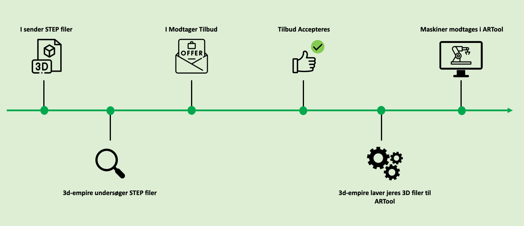 Det er nemt at komme i gang med at bruge ARTool. Proceslinjen nedenfor viser de 6 steps for at kunne begynde at implementere ARTool i jeres organisation.